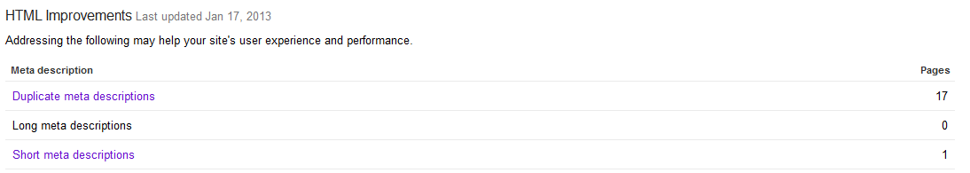 If you are new to Google webmaster, please look at Optimization --> HTML Improvements.
